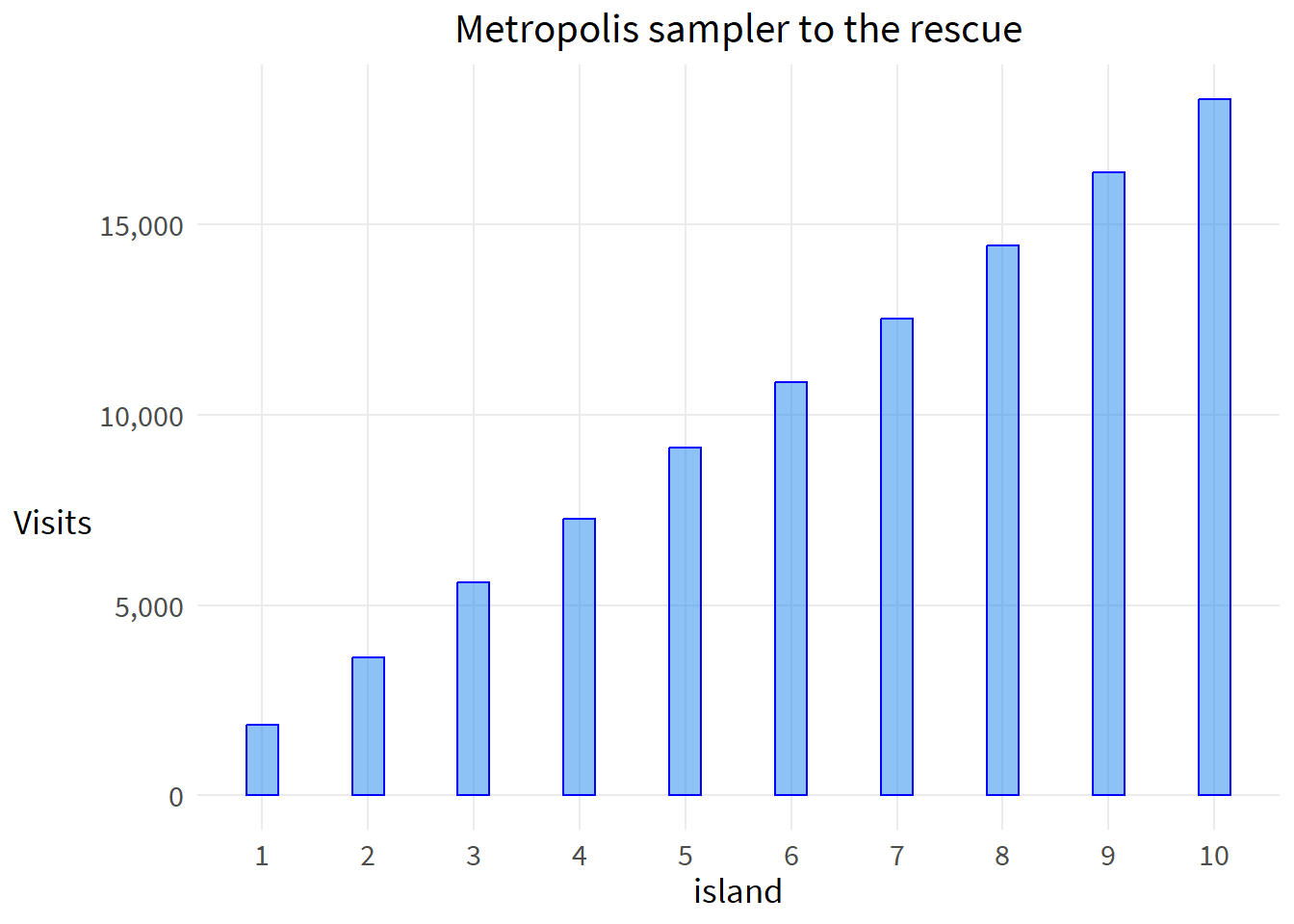 ggplot(out, aes(island)) +geom_bar(color="blue",fill="dodgerblue2",alpha=.5,width=.3) +scale_x_continuous(breaks=1:10) +scale_y_continuous(labels=label_comma()) +labs(y="Visits",title="Metropolis sampler to the rescue") +theme(axis.title.y=element_text(angle=0, vjust=.4))