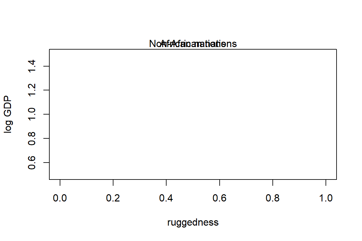 Let’s look at the relationship between terrain ruggedness and economic performance. Generally speaking, one might think that the less rugged the terrain, the easier it is to conduct economic activity and therefore the greater economic performance of a country.