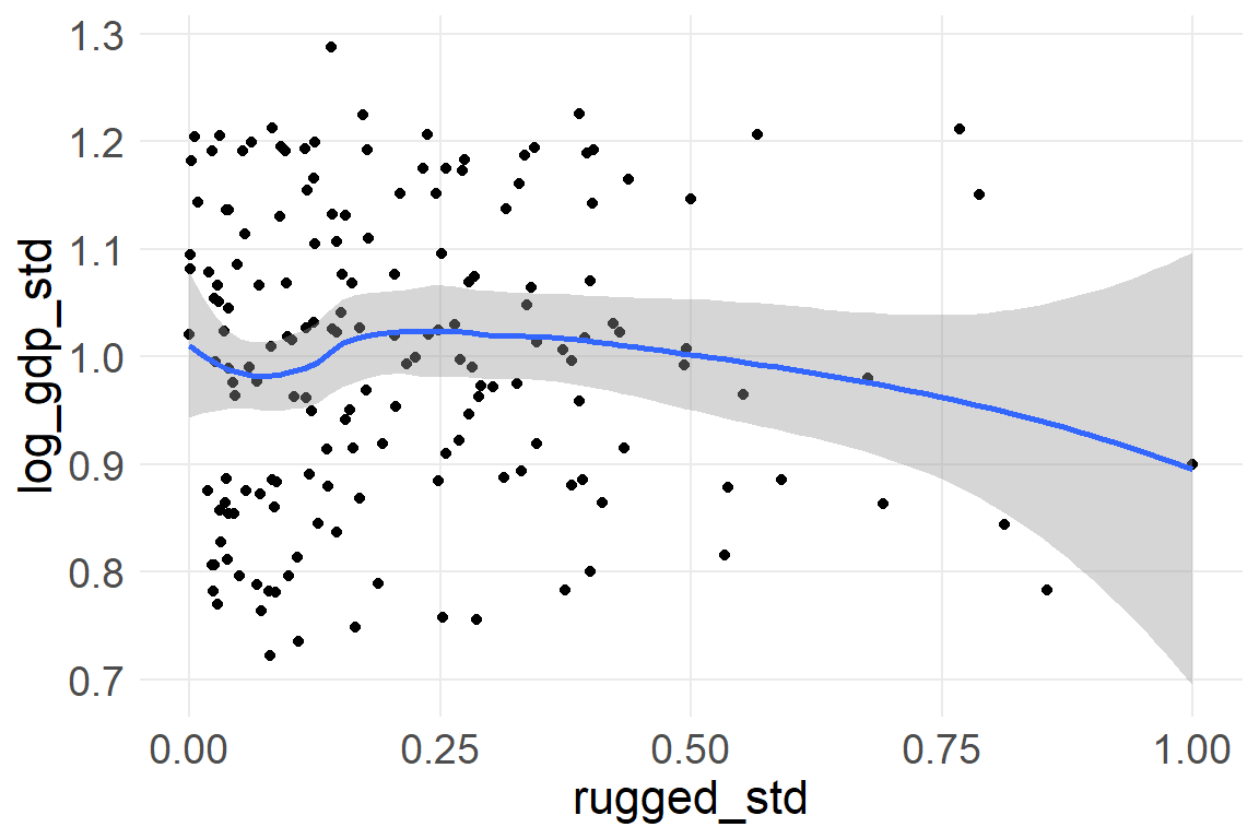 ## R code 8.1 ## prepare datadata(rugged)d <- rugged %>%filter(complete.cases(rgdppc_2000))rm(rugged)d <- d %>%mutate(log_gdp =log(d$rgdppc_2000), # make log version of outcomelog_gdp_std = log_gdp /mean(log_gdp), # text (proportion of mean)log_gdp_sc =scale(log_gdp), # mean 0 sd 1rugged_std = rugged /max(rugged), # text version (0-1)rugged_sc =scale(rugged)) # mean 0 sd 1str(d)